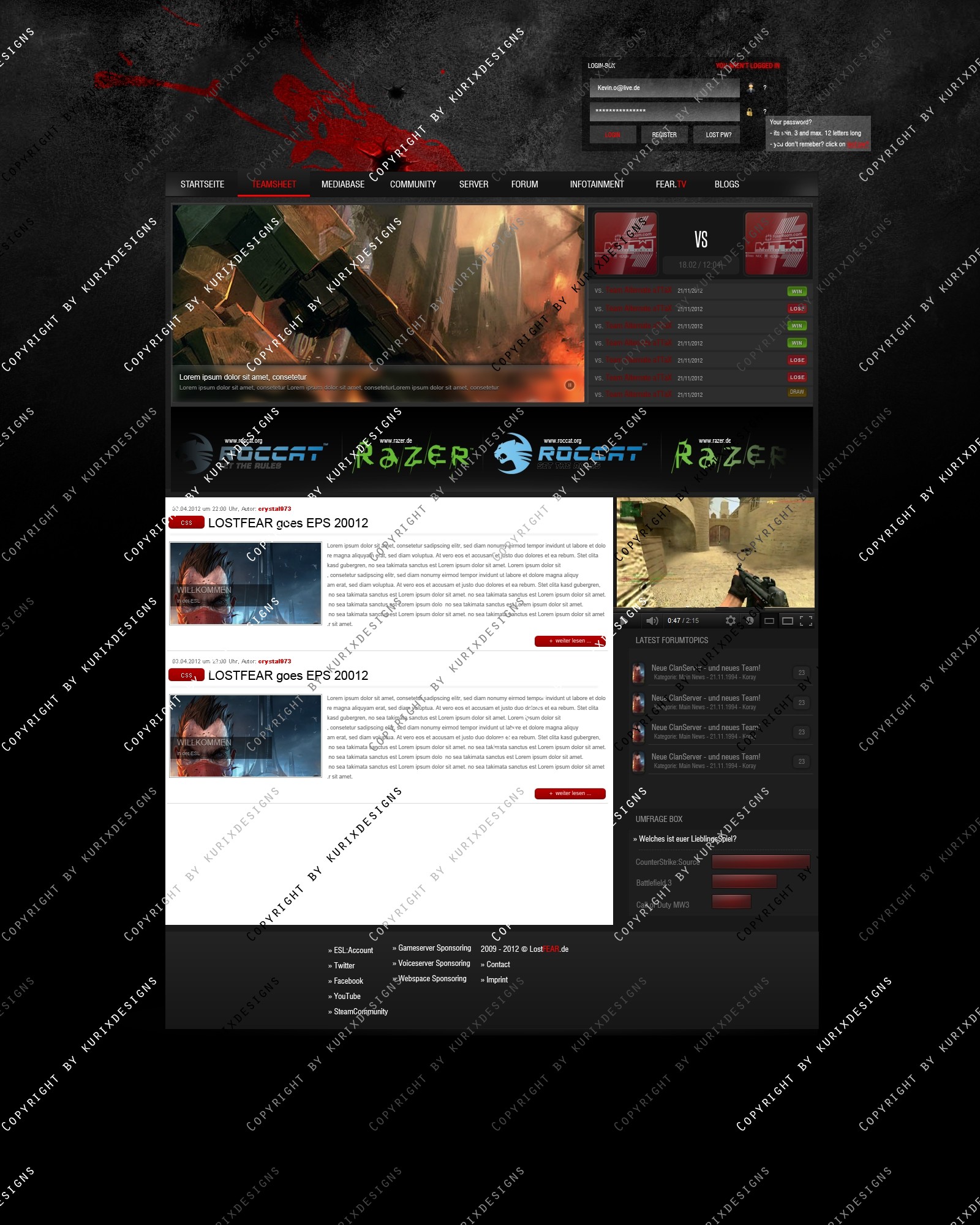 Dies ist ein eSports Design erstellt in Kooperation mit "Lost Fear" und soll für jeden Gaming Clan eine gute Webpräsenz bieten. Sowohl für neue Clans aber auch gestandene Clans ein gutes aber auch preiswertes Design...